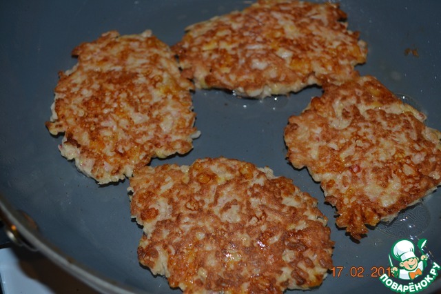 Разогреваем на сковороде растительное масло и ложкой или руками выкладываем массу, формируя оладьи.