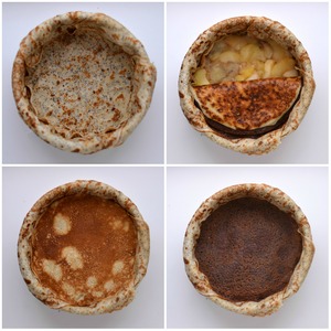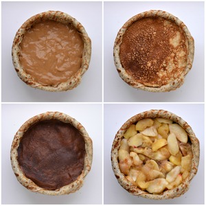 Выложить слой карамелизованных яблок и бананов. Накрыть маковым блином, затем шоколадным. Слегка прижать блины руками ко дну формы – утрамбовать.
