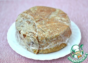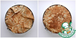 Форму диаметром 18 см выстелить пищевой пленкой. Укладываем в форму 4-5 обычных блинов так, чтобы их края немного свисали с бортика формы. Шоколадный блин обрезать по диаметру формы, уложить на дно.