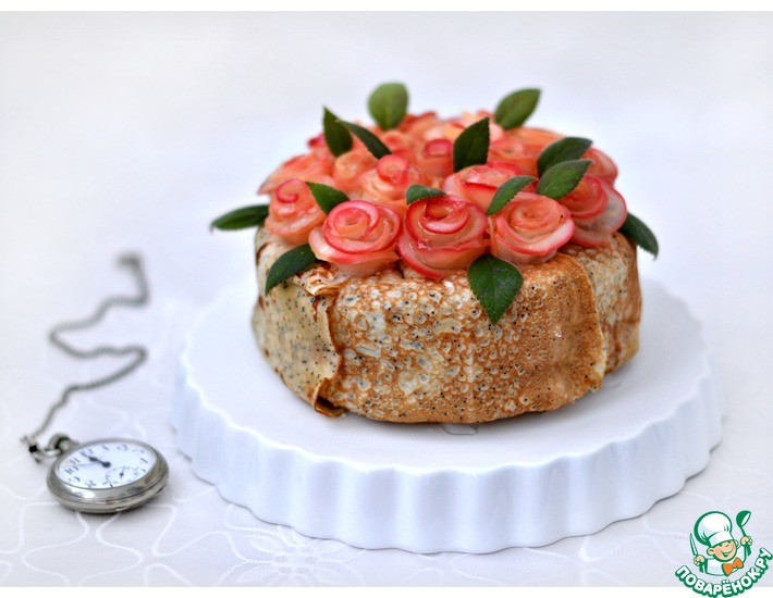Всех поварят поздравляю с началом масленичной недели!!! Это мой первый блинный торт! Сделала специально для этого конкурса. Признаюсь, что раньше как-то искоса поглядывала на блинные торты, сомневалась, что такой торт может понравиться мне и моим капризным домашним). Как же я ошибалась!!! Если есть еще сомневающиеся, то настоятельно вам рекомендую делать подобные торты. Это НЕОБЫКНОВЕННО ВКУСНО: о-о-очень нежно, сытно, но не тяжело. Столько разных оттенков во вкусе, которые только дополняют друг друга. И еще, не поленитесь испечь для этого торта именно 3 вида блинов. Каждый из них дает свой вкус. Особенно порадовали маковые блины. Мак чувствуется, и это дает особый тон во вкусе. Мак лучше добавьте распаренный. Несмотря на то, что описание рецепта и количество ингредиентов велико, торт не сложен в приготовлении, и времени на исполнение занимает не так много. Блины можно испечь заранее. Можно даже заморозить, а в нужный момент достать из морозильной камеры и собрать торт.