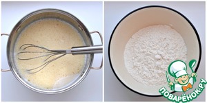 Желтки взбить с крахмалом, сахаром, ванилью, слегка подогретым молоком. -