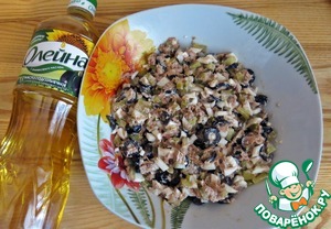 • Тунец разминаем вилкой вместе с маслом. Маслины нарезаем кружочками. Огурец и яйца - небольшими кубиками.