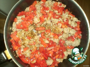 Лук и чеснок очистить, нашинковать. Помидоры вымыть и нарезать кубиками. В сковороде разогреть оливковое масло. Добавить лук, обжаривать, фарш из баранины, перемешать и обжаривать 10 мин. Добавить помидоры, чеснок, гвоздику, лавровый лист, мускатный орех. Посолить, поперчить по вкусу. Готовить 15 мин. -