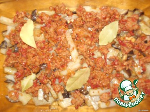 В глубокую огнеупорную форму положить рядами половину обжаренных баклажанов и картофеля. Кружки должны немного заходить друг на друга. Сверху положить половину подготовленного фарша. Разровнять поверхность.