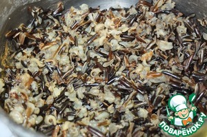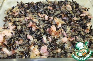 Оставшуюся начинку перемешиваем с рисом и выкладываем на дно формы для запекания.