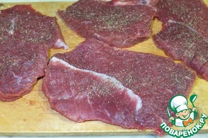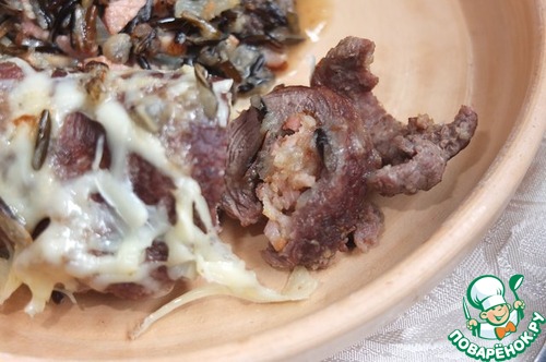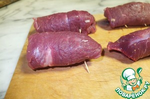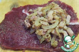 Выкладываем начинку на один конец мяса и сворачиваем его рулетиком.