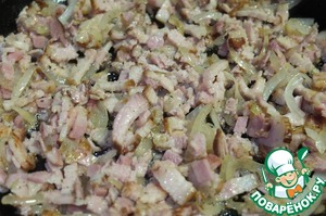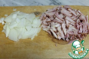 Для начинки бекон нарезаем полосками, лук четвертинками