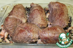 Готовые зразы выкладываем поверх риса и поливаем бульоном из сковороды.