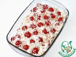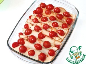 Готовим подливу. Я брала консервированные помидоры чери в собственном соку. Половинки помидорчиков я выложила на блинчики.