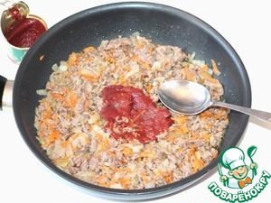 Когда фарш будет готов, положите томатную пасту. Перемешать. Продержать на огне 1-2 минуты, чтобы вкусы смешались. Добавить соль, острый перец и паприку.