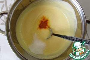 В масло добавляем сметану, соль, сахар и куркуму для желтого цвета.