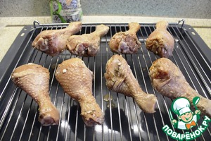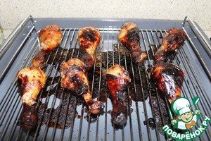 Затем, сольем маринад и разместим голени на решетку. Готовим на гриле при температуре 180 - 190 градусов, в течение 30 - 40 минут, пару раз переворачиваем.