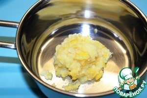 Пока куриные голени готовятся можно приготовить соус. Для соуса половину лимона разрезам на небольшие кусочки и пюрируем блендером, помещаем в небольшую кастрюлю.