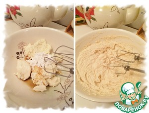Пока тесто отдыхает делаем начинку. Сливочный сыр и творог должны быть комнатной температуры. Соединяем в отдельной посуде все ингредиенты для начинки кроме джема и взбиваем всё миксером до кремообразного состояния.
