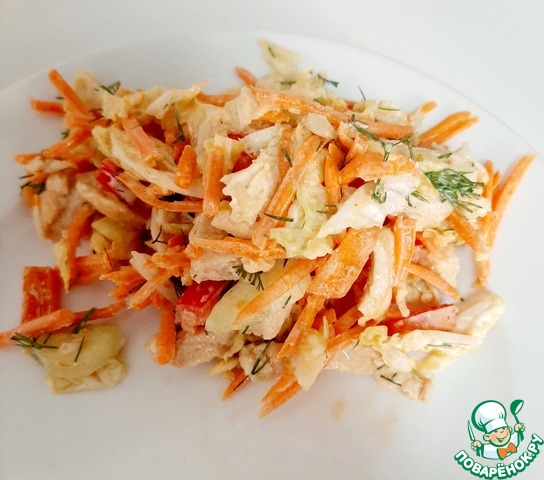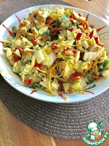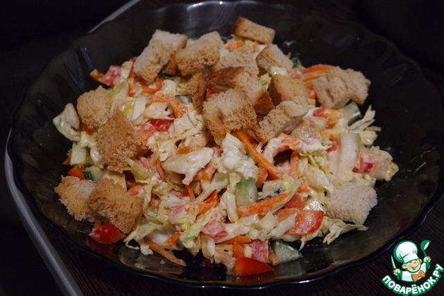 Летом очень часто на даче делаем. Только вместо пекинской капусты - много зелени салата плюс зеленый лук, укроп.. все что на грядке растет! Зимой пекинская капуста. Варианты с продуктами каждый под себя может добавить или исключить. Основные только нужно оставлять: курица, сухарики, зелень, свежий огурец, заправка.