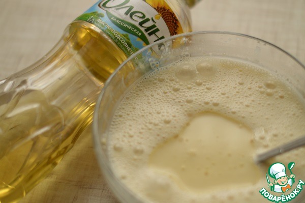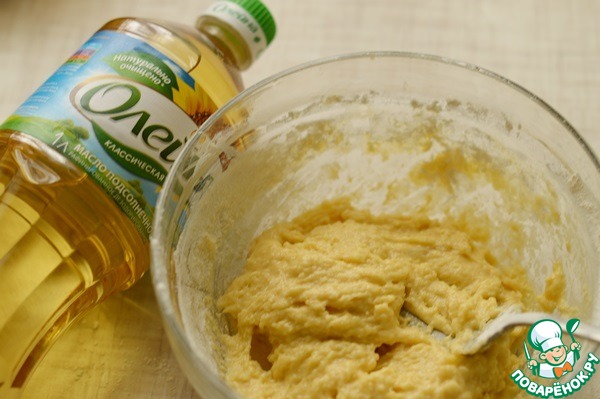 В чашке смешать муку с сахаром, яйцами, растительным маслом.