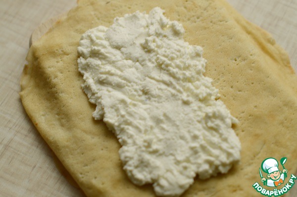 Творог смешать с сахарной пудрой. Вишню разморозить и выложить в дуршлаг, чтоб хорошо стек сок и она обсохла. На доску выложить обычный блин. Сверху, на середину, выложить часть творога. Примерно на 1/3 блина