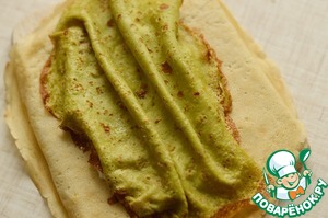 Затем тесто разделить на 2 части. В одну добавить фисташковую пасту и хорошо взбить. Испечь на хорошо разогретой сковороде разноцветные блины.