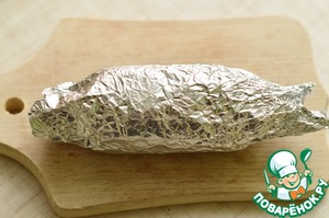 Затем аккуратно свернуть рулет, по принципу роллов. Завернуть плотно в фольгу и убрать в морозилку на 30 минут.