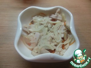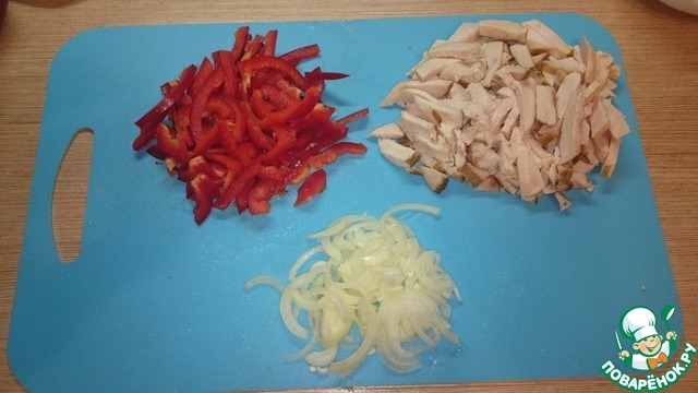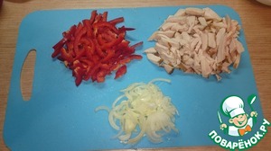 Нарежем лук полукольцами, перец и курицу соломкой