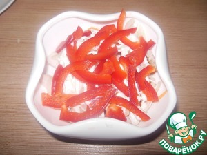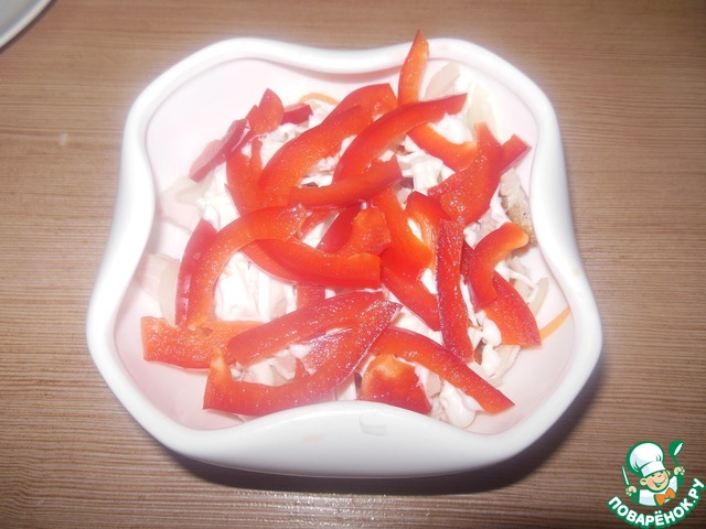 И выкладываем наш сладкий перец. Украшаем маслинами.