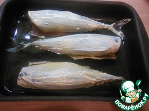 Скумбрию хорошо помыть, посолить, обильно посыпать специями для рыбы, и намазать сметаной (любители майонеза, могут проделать эту процедуру с ним)