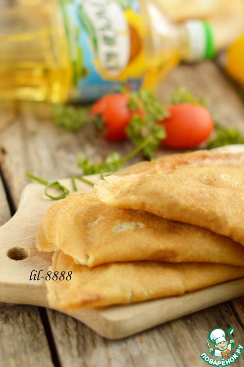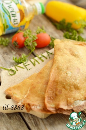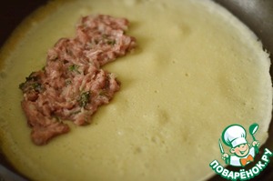На разогретую сковороду налить тесто, когда блин поджарится с одной стороны, на половинку блина быстро выложить немного начинки.