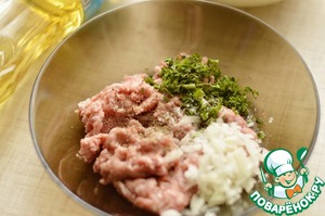 Смешать мясо с луком, зеленью, посолить и поперчить.