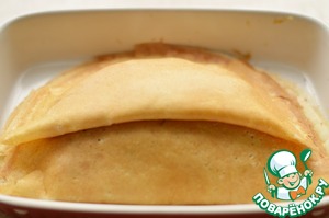 Затем блин снять со сковороды и переложить в форму для выпечки. Каждый блин смазать растопленным сливочным маслом, чтобы они не слиплись. -