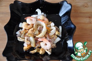Кладём маринованные морепродукты вместе с соевым соусом, я не солю.