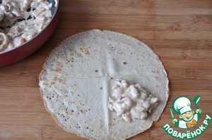 Берём блин, кладём начинку (морепродукты) на четвёртую часть блинчика. Накрываем второй половиной, заворачиваем уголком, кулёчком.