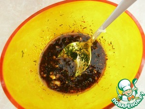 Смешиваем ингредиенты для маринада (масло, соевый соус, чеснок, специи, укроп)