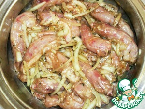 Добавить маринад к шейкам, к ним же добавить луковицу порезанную на четвертинки, и хорошенько перемешиваем. оставляем на 20 -30 минут