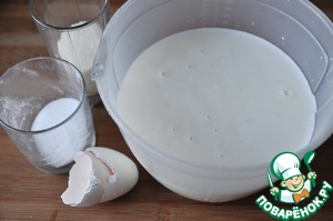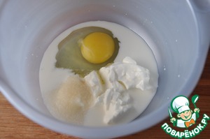 В ёмкость наливаем молоко, кладём сметану, яйцо, сахар, соль, ванилин и взбиваем 1 минуту миксером. -