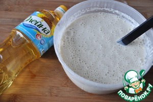 Добавляем муку, разрыхлитель, подсолнечное масло "Олейна" (2 ст. ложки) и ещё раз всё взбиваем до однородности, чтобы не было комочков.