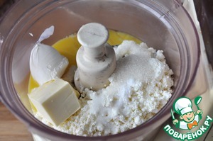 В кухонный процессор загружаем сливочное масло комнатной температуры, желтки яиц, сахар (40 г), творог, сметану, соль и ванилин.