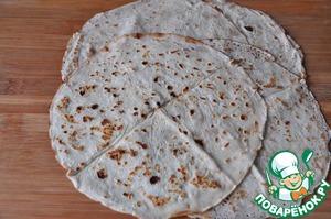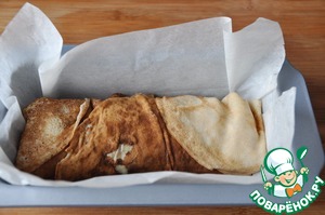 Берём блины и складываем внахлест. Я сначала взяла 4 блина, но потом подложила ещё 2, так как начинка немного жидковата.