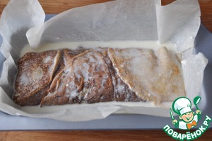 Сворачиваем в рулет. Кладём в форму для запекания, застланную пекарской бумагой.