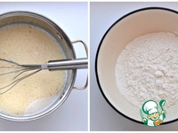 Влить в тесто кипяток. Быстро перемешать венчиком до однородного состояния. Влить растительное масло «ОЛЕЙНА», всыпать соду. Хорошо перемешать. Дать тесту постоять минут 10-15.