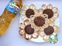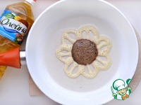 Светлое тесто налить в дозатор для теста и выливать на сковороду, рисуя лепестки подсолнуха.