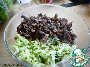 Добавить в салатник к фасоли и огурцам наши грибочки.