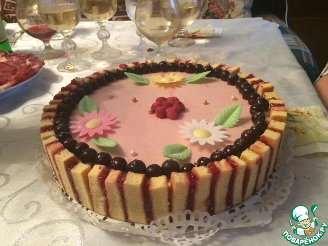 У охлажденного бисквита обрежьте края по периметру. Разрежьте бисквит на 5 полосок одинакового размера Намажьте бисквит, малиновым джемом.
