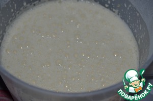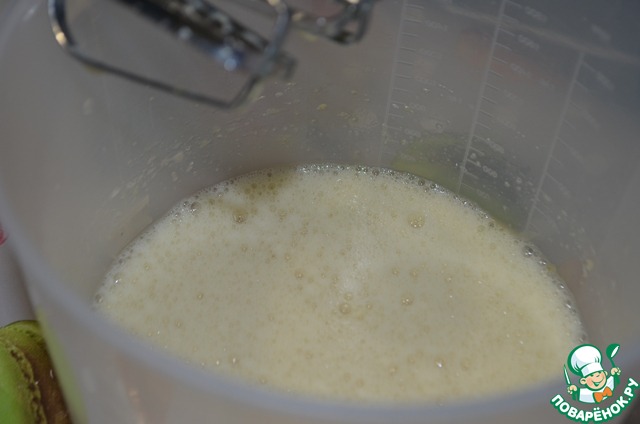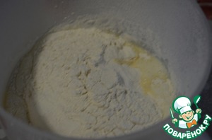 Развести 1 стаканом молока, всыпать муку с разрыхлителем, вымесить тесто до гладкости.
