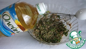 Затем по одной ложке добавлять растительное масло, постоянно перемешивая и как бы растирая, пока не достигнете нужной густоты.