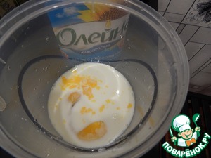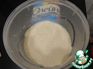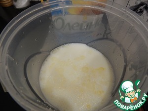 Разбить яйцо в емкость, добавить сахар, соль, соду на кончике ножа, стакан молока, стакан крутого кипятка. Взбить миксером.