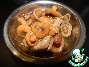 Промыть маринованные грибы, добавить ложку растительного масла.