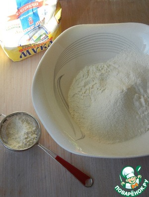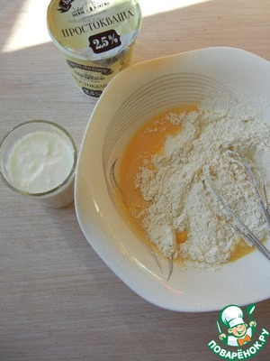 Далее добавляем простоквашу (кефир), она должна быть комнатной температуры. Тесто хорошо перемешиваем и добавляем соль. Готовое тесто должно быть похоже на сметану (не жидкую). Белки взбиваем в отдельной миске, добавляем к тесту и быстро перемешиваем.