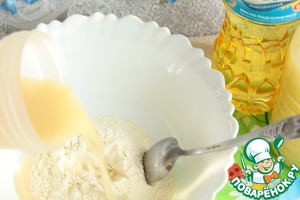 В 175 мл теплой сыворотки развести 1 ч. л. сухих дрожжей.