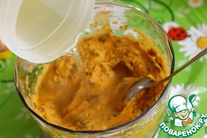 Морковь отваренную с майонезом, кориандром, мускатным орехом и укропом измельчить в блендере до состояния морковного пюре.