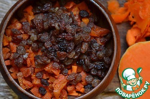 Добавить промытый изюм. Ни изюм, ни курагу замачивать в горячей воде не надо.